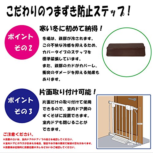 マジックアクションがお子様の安全とかんたん操作!オートクローズ・オートロック機能。 お子様が操作を覚えてしまうことを考慮した独自のレバー操作。 お子様が不在時に便利な前後開放機能付き。 つまずき防止のステップは、片側のみの取り付けができるマルチステップ。 冷たい鉄部をカバーします。 つっぱり式でしっかり設置。取り付け幅70-94cm。 別売拡張フレームで最大94-103cmまでご使用いただけます。