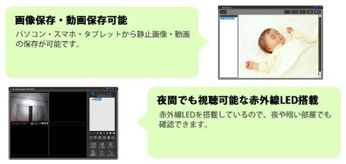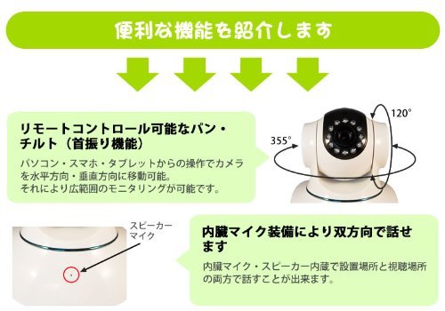 - 赤外線LED:10個/投影距離:約10m ●画像圧縮方式:Motion-JPEG ●解像度:VGA(480*640)/QVGA(240*320) ●フレームレート:Max30fps ●上下左右反転機能:あり(横方向:350°/縦方向:120°)