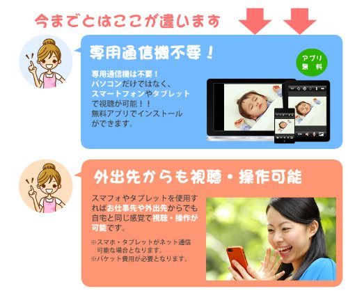 スマホ・タブレットから操作ができる!赤外線カメラで夜でも鮮明!外出先からでも使える!双方向音声でしゃべれるベビーモニター です。日本語簡単セットアップ説明書もあり、接続も簡単。赤ちゃんだけでなく、留守中のペットの様子や防犯などにも使用できます。