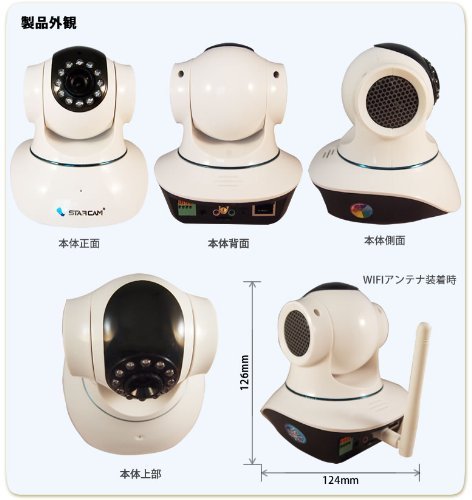 - セキュリティー WEP/WPA/WPA2Encryption ●DDNS Free DDNS :レンズサイズ 3.6mm広角レンズ:センサータイプ 1/4インチ30万画素CMOS ●S/N比:≧45dB ●必要最低照度:0.1Lux/暗視時:0.01Lux
