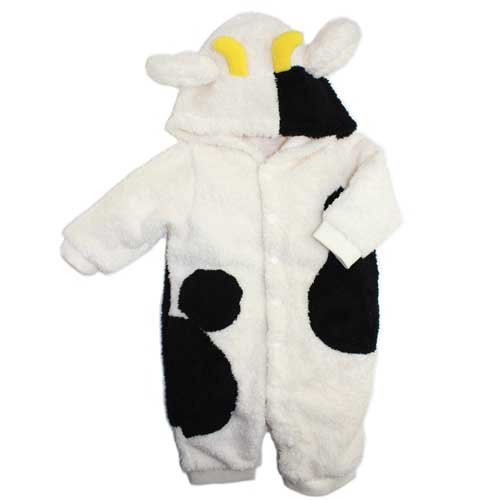 お出かけ用、ハロウィン用、年賀状用、記念撮影用の着ぐるみです。 軽くて、暖かいシャギーフリースのブチの ウシさんの角がついたフードです。 おしりのシッポがカワイく 目立ちます。