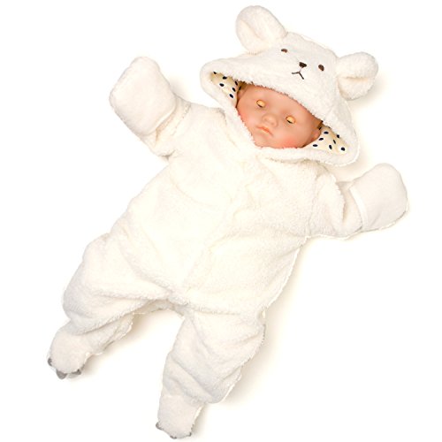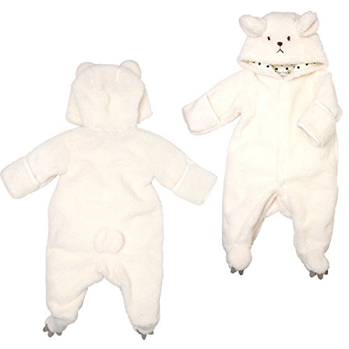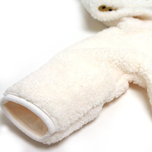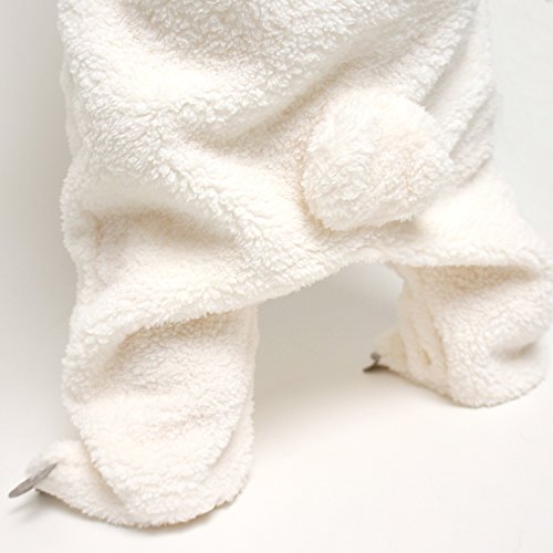 お出かけ用、ハロウィン用、年賀状用、記念撮影用の着ぐるみです。 軽くて、暖かいシャギーフリースの クマさんの耳と 顔刺繍がついたフードです。 おしりのシッポがカワイく 目立ちます。 また、足の先には フェルトのつめがついていてかわいい♪