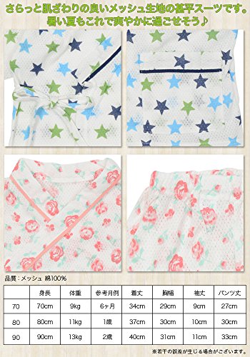 メッシュ素材の甚平スーツです。 暑い夏のパジャマがわりにもOK。 ブルーは星柄、ピンクはバラ柄がかわいい日本の甚平です。 夏のお出かけ、イベントに大活躍間違いなし。 吸湿性・通気性があり、肌ざわりもやわらかな綿素材です。