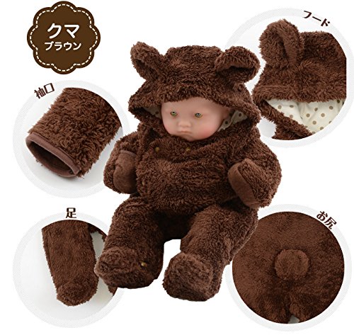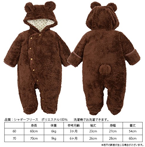 お出かけ用、ハロウィン用、年賀状用、記念撮影用の着ぐるみです。 軽くて、暖かいシャギーフリースの クマさんの耳や 羊のつのやおしりのシッポがカワイく 目立ちます。 フード裏は、水玉がデザインポイント。