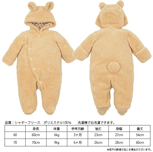 お出かけ用、ハロウィン用、年賀状用、記念撮影用の着ぐるみです。 軽くて、暖かいシャギーフリースの クマさんの耳や 羊のつのやおしりのシッポがカワイく 目立ちます。 フード裏は、水玉がデザインポイント。