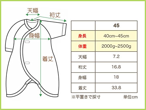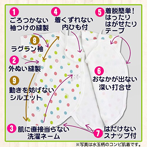 1.肌にやさしい縫製 2.縫代が肌を刺激しない外ぬい縫製 3.肌を刺激しない場所に洗濯ネーム。 4.着くずれしない内ひも付き。 5.着脱を手早く簡単に、はったり、はがせたり面テープを採用。肌を刺激しない柔らかい面テープです。 6.はだけたりおなかがでない深い打合せ。 7.足をバタバタしてもはだけない、スナップ(プラスッチク製のプランサー)付き。 8.袖底にゆとりがあるラグラン袖は腕を動かしやすく、着せてあげるときも楽に着せれる設計。 9.足の運動を妨げない裾広がりのシルエット。