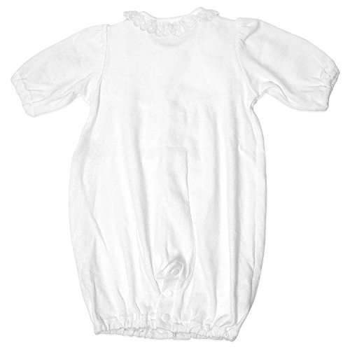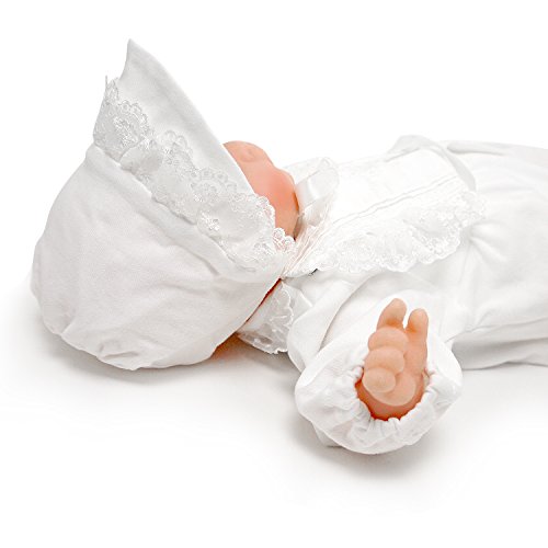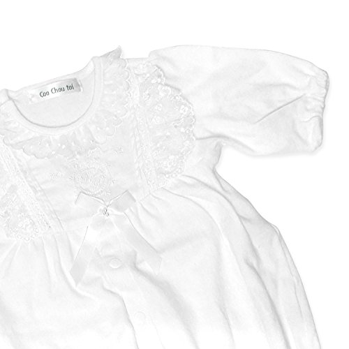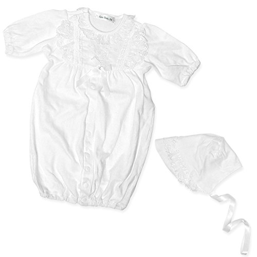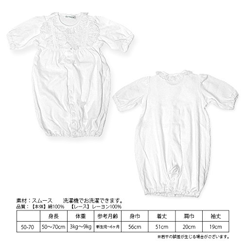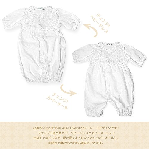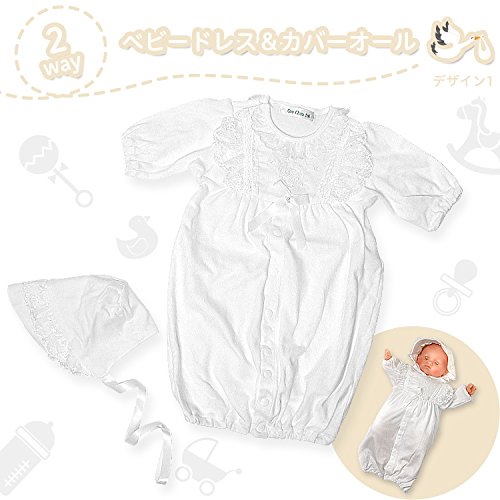 帽子にもドレスと同じレースがついいています。 シンプルで可愛いデザインなので、退院や、お披露目の時や、お食い初め(百日祝い)などの際にも活躍してくれます。 股部分のスナップボタンを付け替えるとカバーオールにもなる、便利なツーウェイタイプのドレスです
