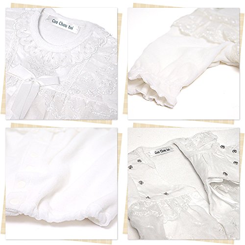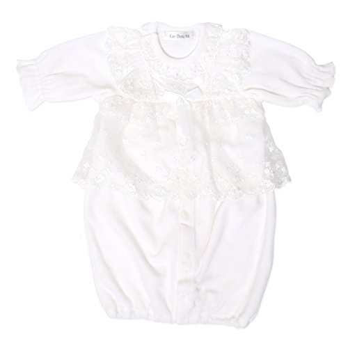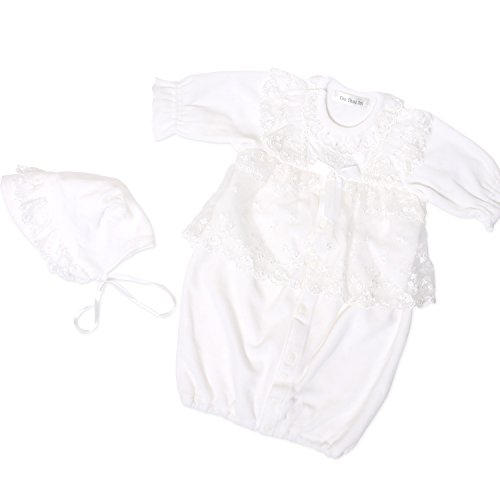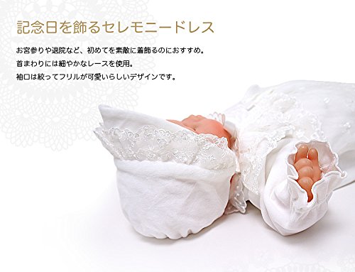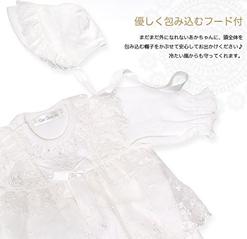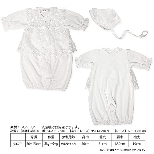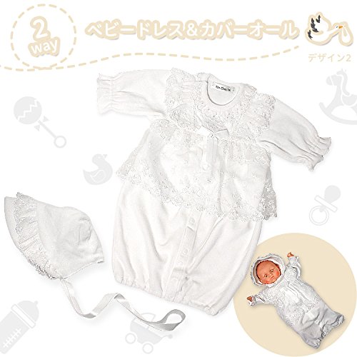 帽子にもドレスと同じレースがついいています。 シンプルで可愛いデザインなので、退院や、お披露目の時や、お食い初め(百日祝い)などの際にも活躍してくれます。 股部分のスナップボタンを付け替えるとカバーオールにもなる、便利なツーウェイタイプのドレスです