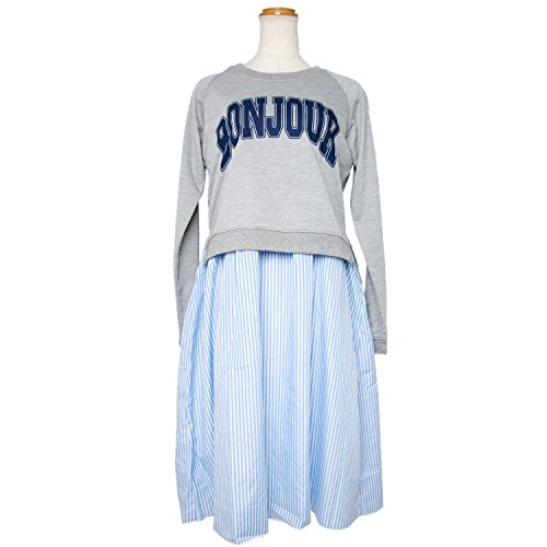 【Mサイズ】着丈100cm バスト94cm 袖丈59cm 肩幅37cm 異素材MIXガーリーワンピース。 ロゴ入り スエットトップスとストライプのスカートをあわせたドッキングワンピース。 1枚でコーディネイト完成です。 時短アイテム。 トップスをめくると授乳口がついいています。