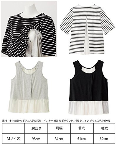 背中にスリットがあり、インナーのシフォンを見せるデザインです。 ボーダーと無地の 2枚組みのチュニックです。 インナーのシフォンは背中にタックがあり バックスタイルがおしゃれです。 インナーには 授乳口があります。 【寸法】胸周り98cm肩幅37cm着丈61cm袖丈30cm