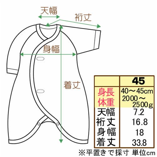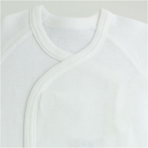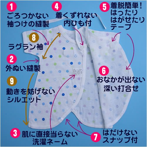 1.肌にやさしい縫製 2.縫代が肌を刺激しない外ぬい縫製 3.肌を刺激しない場所に洗濯ネーム。4.着くずれしない内ひも付き。5.着脱を手早く簡単に、はったり、はがせたり面テープを採用。肌を刺激しない柔らかい面テープです。 6.はだけたりおなかがでない深い打合せ。7.足をバタバタしてもはだけない、スナップ(プラスッチク製のプランサー)付き。 8.袖底にゆとりがあるラグラン袖は腕を動かしやすく、着せてあげるときも楽に着せれる設計。9.足の運動を妨げない裾広がりのシルエット。