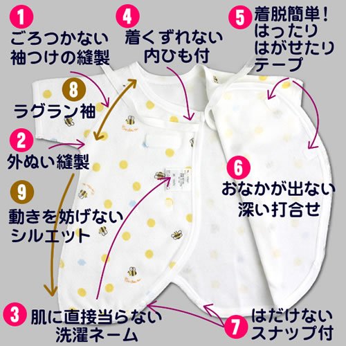 1.肌にやさしい縫製 2.縫代が肌を刺激しない外ぬい縫製 3.肌を刺激しない場所に洗濯ネーム。4.着くずれしない内ひも付き。5.着脱を手早く簡単に、はったり、はがせたり面テープを採用。肌を刺激しない柔らかい面テープです。 6.はだけたりおなかがでない深い打合せ。7.足をバタバタしてもはだけない、スナップ(プラスッチク製のプランサー)付き。 8.袖底にゆとりがあるラグラン袖は腕を動かしやすく、着せてあげるときも楽に着せれる設計。9.足の運動を妨げない裾広がりのシルエット。