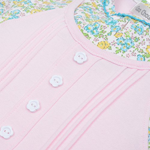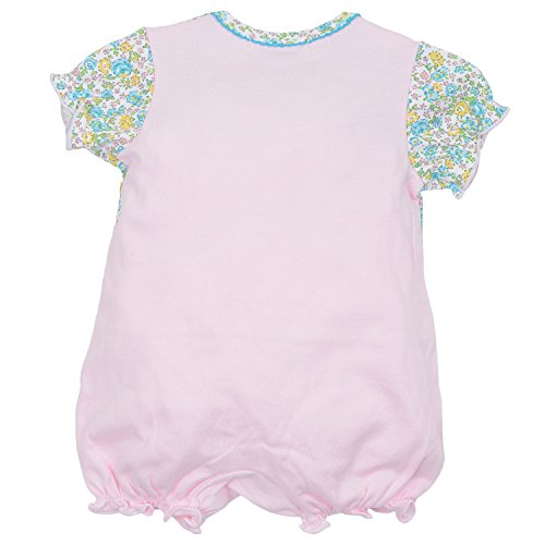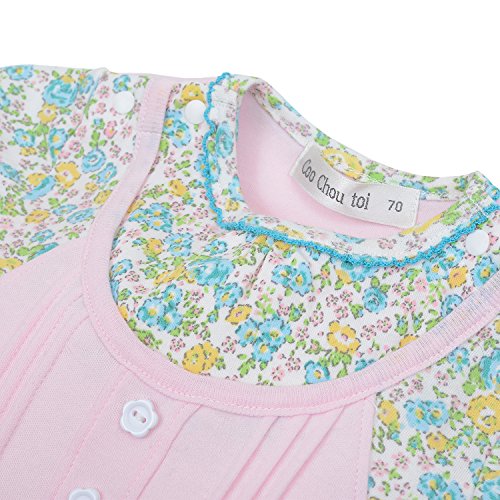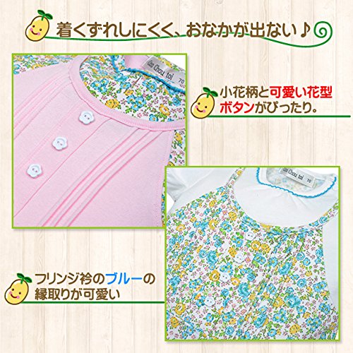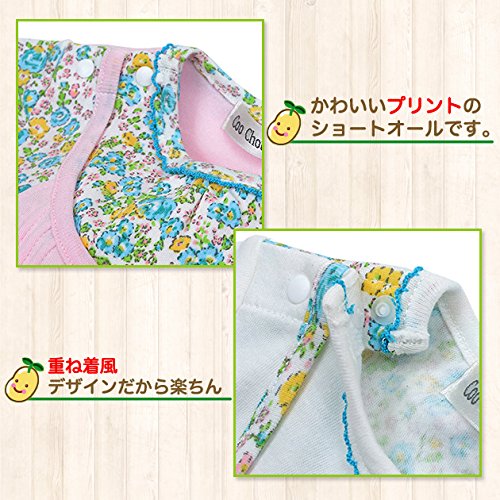 リバティ風の花柄のショートオールです。 着た風のデザインですが、一枚仕立ての商品です。 前のピンタックと 花型の釦がデザインポイントです。 首ぐりにも ピコミシンの飾り付です。
