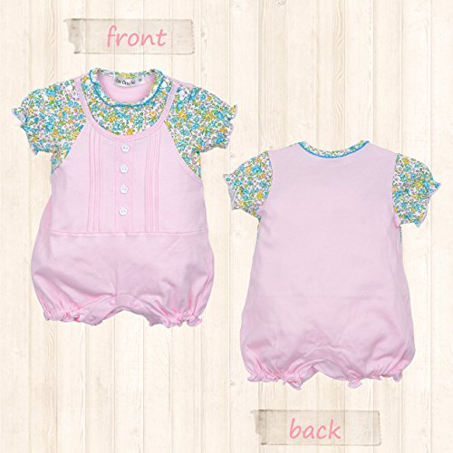 リバティ風の花柄のショートオールです。 着た風のデザインですが、一枚仕立ての商品です。 前のピンタックと 花型の釦がデザインポイントです。 首ぐりにも ピコミシンの飾り付です。