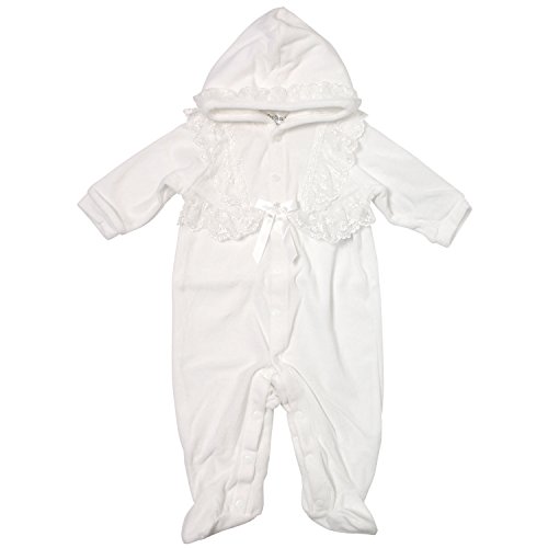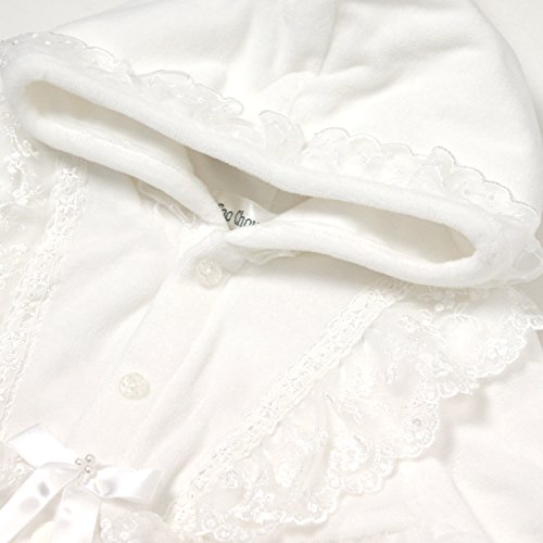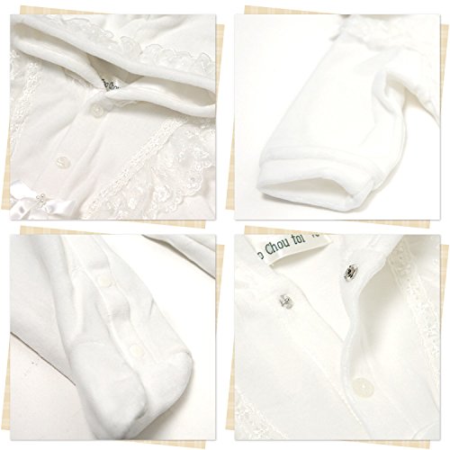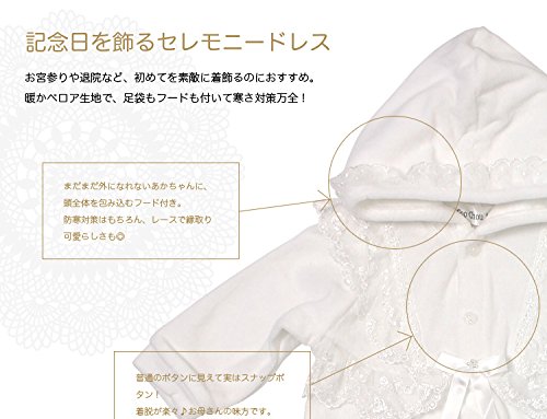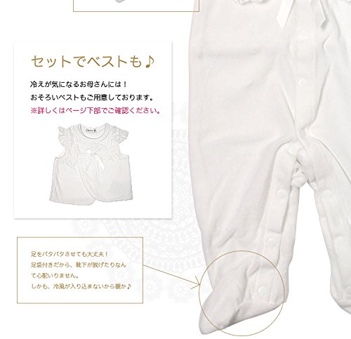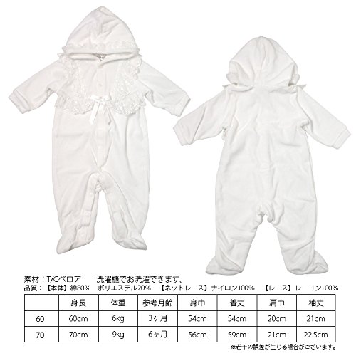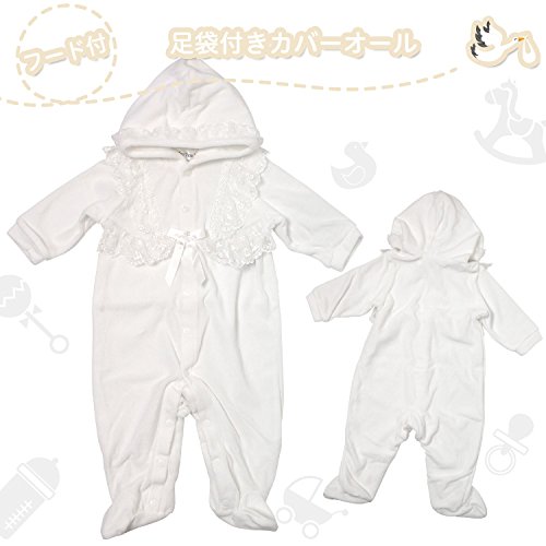 フードにもドレスと同じレースがついいています。 シンプルで可愛いデザインなので、退院や、お披露目の時や、お食い初め(百日祝い)などの際にも活躍してくれます。 足袋付のカバーオールです。