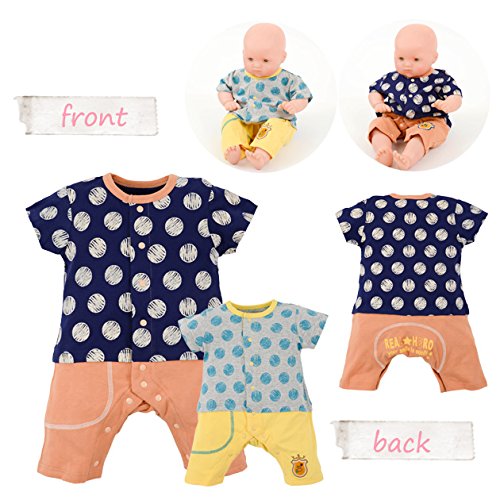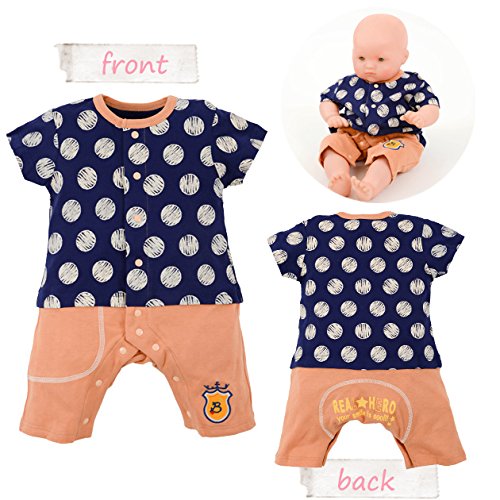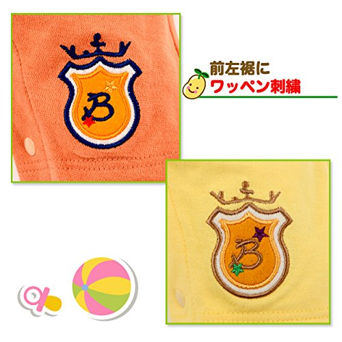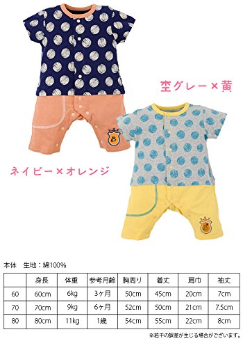 赤ちゃんのお肌にやさしい仕様(*^o^*) 手書き風の水玉プリントです 裾にワッペン刺繍あり おしりが切り替えデザインになっていてプリントのポイントもあります。 上着を着た風なデザインです。