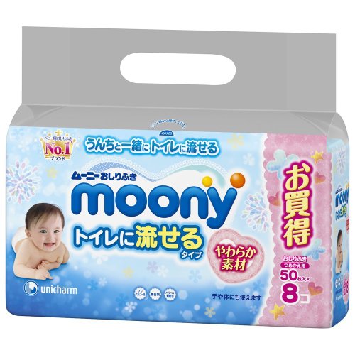 やさしく拭けて! トイレに流せる! ムーニーおしりふき トイレに流せる やわらか素材 替 50枚×8パック 4入り