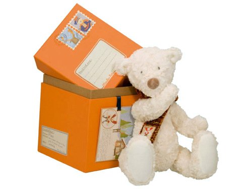 フランス、Moulin Roty(ムーランロティ)の昔ながらの伝統的なデザインのクマさんのぬいぐるみです。 伝統的なクマのぬいぐるみの首には、可愛らしくマフラーが巻いてあります。 パッケージも小包のようなデザインで、とってもユニークです。 高級感と面白さがあって、プレゼントにも素敵です♪ インテリアとして、お部屋に飾ってもカワイイですね。