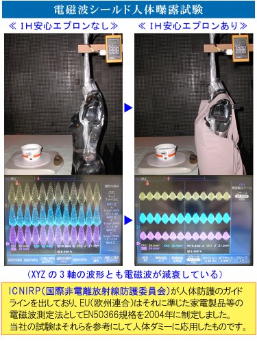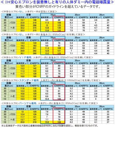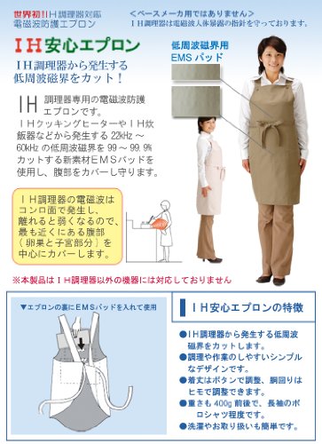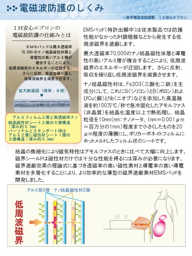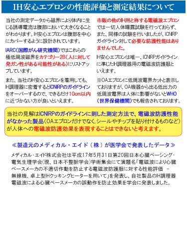 ≪IH安心エプロンの特長≫IH調理器によるペースメーカ・ICD誤動作防止に成功したメディカル・エイドの製品です!最大透磁率70,000のナノ結晶磁性体層と導電性の高いアルミ層を積層させた「EMSパッド」は、低周波磁界をカットし、IH調理器側面から10cmまでなら国際非電離放射線防護委員会(ICNIRP)が定めた人体電磁波曝露基準をクリアできます。詳しい商品説明はこのページトップの商品画像下にある「その他のイメージを見る」をクリックして下さい。