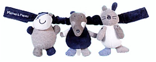 ベビーカーのバーに取り付け可能なラトル。ラトルはソフトなさわり心地で、ひとつずつ取り外しができる。誤飲の原因となるビーズやボタンを使わず、目や口が刺繍になっている。