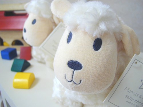 光沢のある巻き毛の布をふんだんに使用したオルゴール。しっぽを引くとオルゴールがやさしく鳴る。誤飲の原因となるビーズやボタンを使わず、目や口が刺繍になっている。