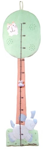 壁に掛ければ50cm~150cmまで測れる身長計。かわいいハチのマグネットでしるしが付けられる。すべてにソフトな手触りとやわらかい色の布を使用している。