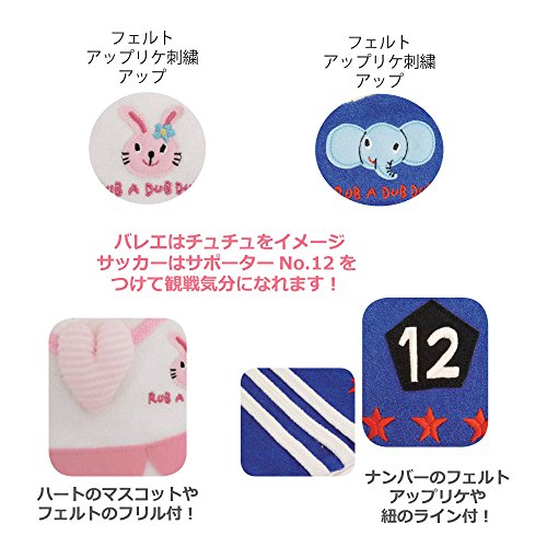 バレエには、ハートのマスコットやフェルトのフリル付。サッカーには、ナンバーのフェルトアップリケや紐のライン付き。