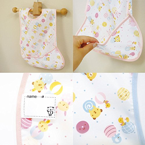 食事の時に服が汚れるのを防いで便利。面ファスナーで着脱簡単。名前が書けるスペース付き。