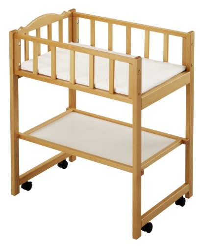 床から床板(寝台)までの高さが70cmなので腰をかがめず楽な姿勢でおむつ換えができます。足元の面以外の3面は柵があるので、おむつ替えの時に赤ちゃんが動いても台から落ちる 心配がありません。寝台の下に物が置ける収納棚が付いています。 重量は約10Kg。塗料は揮発性の有害物質を含んでいない「エコ塗料」を使用。接着剤やボードも安全性の高い素材を厳選して使用していますので、病院や保育園など公共施設でも安心してお使いいただけます。4輪キャスター付(ストッパー付)