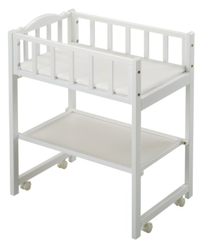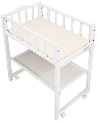床から床板(寝台)までの高さが70cmなので腰をかがめず楽な姿勢でおむつ換えができます。足元の面以外の3面は柵があるので、おむつ替えの時に赤ちゃんが動いても台から落ちる 心配がありません。 寝台の下に物が置ける収納棚が付いています。 重量は約10Kg。塗料は揮発性の有害物質を含んでいない「エコ塗料」を使用。接着剤やボードも安全性の高い素材を厳選して使用していますので、病院や保育園など公共施設でも安心してお使いいただけます。4輪キャスター付(ストッパー付)