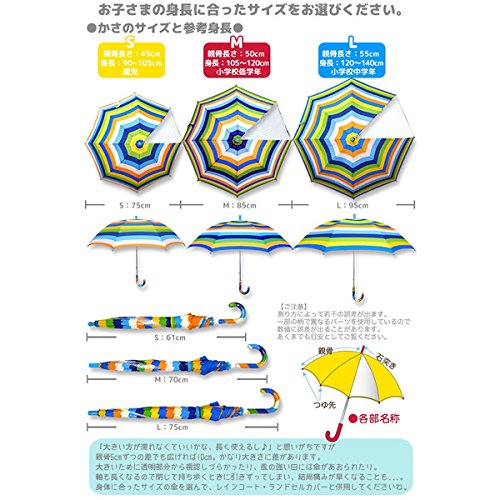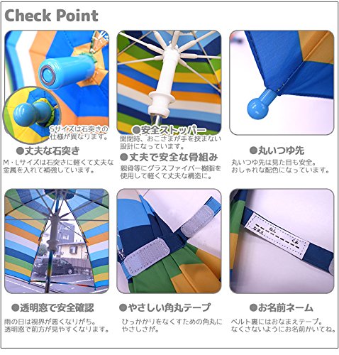 幅・色の違うボーダーが組み合わさったおしゃれでカッコいいデザインは、落ち着いた色味を使いながら、ホワイトカラーでしっかり目を引くデザインなので視界の悪い日も目立って安心!軽くて丈夫、安全ポイントがたくさん!!*透明窓…視界を広げて見やすく。*さびにくく軽くて丈夫…グラスファイバー樹脂の骨を使用。*安全ストッパー付開閉(手動)…手が痛くなく手をはさみません。*安心パーツ仕様…角丸マジックテープとベルト内側に名前タグ付。*丈夫な石突き…M、Lサイズは金属で補強。※Sサイズは先が丸くなるため補強はありません。※商品により、ボーダーの出方が違います。ご了承ください。