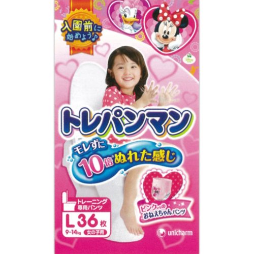 [トレパンマン 女の子用 L 36枚(パンツタイプ)]は、トレーニング用紙おむつです。●モレずに10倍ぬれた感じを実現しました。万が一、失敗してもおしっこ2回分をしっかり吸収。●「お知らせサイン」声かけのタイミングがひと目でわかる(おしっこをするとラインが「黄色から青緑色」に変わる。)●「まるめるテープ」で後処理が簡単。