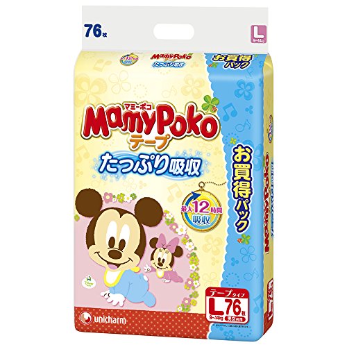 ●【商品説明】●「マミーポコ テープ Lサイズ ディズニー 76枚」は、ディズニーキャラクターのハロウィンデザイン、モレ安心のかわいい紙おむつテープ式 Lサイズです。●最大12時間分のおしっこをらくらく吸収。●ユニ・チャーム独自の高吸水性ポリマーを搭載した『たっぷり吸収体』だから、長時間遊んでもモレ安心です。●お肌さらさら「やわらか全面通気シート」が、湿った空気をすばやく外に逃がすので、赤ちゃんご機嫌。●「お知らせサイン」で、取り替え時期がひと目でわかります。●「しっかりラクラクテープ」で、しっかりくっついて何度でも付け直しできます。●体重9-14kgのお子様に。●男女兼用。●※赤ちゃんのおしっこ量には個人差があります。●(C)DISNEY●【お問い合わせ先】●ユニ・チャーム株式会社お客様相談ダイヤル:0120-192-862受付時間(祝日を除く)月曜日-金曜日9:30-17:00●【素材】●表面材:ポリオレフィン・ポリエステル不織布吸水材:綿状パルプ、高分子吸水材、吸水紙防水材:ポリオレフィンフィルム止着材:ポリオレフィン伸縮材:ポリウレタン結合材:スチレ...