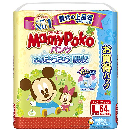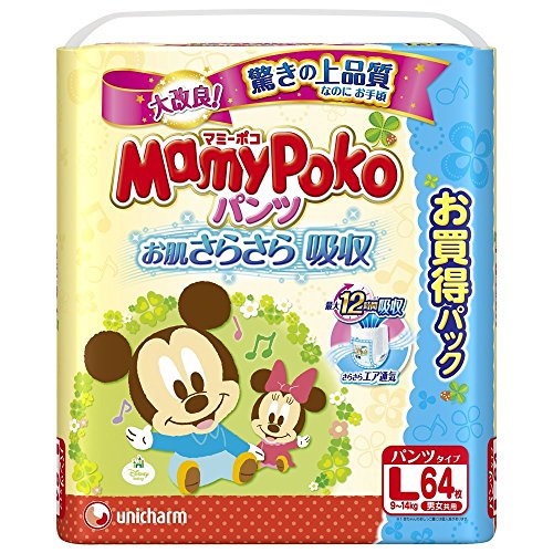 ●【素材】●表面材:ポリオレフィン不織布吸水材:綿状パルプ、吸水紙、高分子吸水材防水材:ポリオレフィンフィルム止着材:ポリオレフィン伸縮材:ポリウレタン結合材:スチレン系エラストマー合成樹脂●【ご注意】●【使用上の注意】・汚れた紙おむつは早くとりかえてください。●・テープは直接お肌につけないでください。●・誤って口に入れたり、のどにつまらせることのないよう、保管場所に注意し、使用後はすぐに処理してください。●【保管上の注意】開封後は、ほこりや虫が入らないよう、衛生的に保管してください。●【使用後の処理】・紙おむつに付着した大便は、トイレに始末してください。●・汚れた部分を内側にして丸めて、不衛生にならないように処理してください。●・トイレに紙おむつを捨てないでください。●・使用後の紙おむつの廃棄方法は、お住まいの地域のルールに従ってください。●・外出時に使った紙おむつは持ち帰りましょう。●【商品説明】●「マミーポコパンツ Lサイズ ディズニー 64枚」は、ディズニーキャラクターのハロウィンデザイン、上品質なお手頃パンツ式 Lサイズです。●繰り返しのおしっこを...