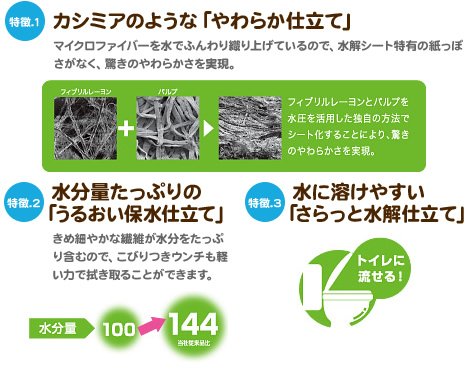 しっとり水分! トイレに流せる こすらずスッキリ 極細繊維をふんわり織り上げ 軽い力で拭けて、やわ肌にやさしい やさしく拭けて、トイレニ簡単ポイ! ウンチと一緒に流せて オムツ替えの後始末が簡単便利! ノンアルコール・無香料 手や体にも使えます トイレに流せるやわらか素材は、マイクロファイバーを ふんわりと織り上げた柔らかな水解シート ワンタッチで軽~くオープンできます ●1ケース 50枚 5個パック*8入り(合計2000枚) 製造元 ユニチャーム株式会社 日本製品 1枚価格 2.19円