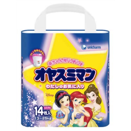 「オヤスミマン 女の子用 14枚」は、昼間のおむつは外れたけど、夜のおねしょがまだ心配なお子様のためのパンツ型夜用おむつです。パワフル吸収体が一晩中のたっぶりおしっこもしっかり吸収。おなか側のワイドな吸収ゾーンが、おなかやサイドからのモレを防ぎます。また、やわらかストレッチ素材でお子様の体に自然にフィット。全面通気性シートで一晩中ムレずに快適です。薄型でまるで木綿の下着のようなパンツ型なので、昼間のおむつが外れたお子様にも抵抗なくご使用いただけます。女の子に大人気のディズニーキャラクターのデザインが、1袋に4種類入っています。体重13kg-25kgのお子様に。14枚入り。 ×写真はイメージです。デザインは予告なしで変更されることがあります。 内容量:14枚 サイズ : 230×245×165(mm)