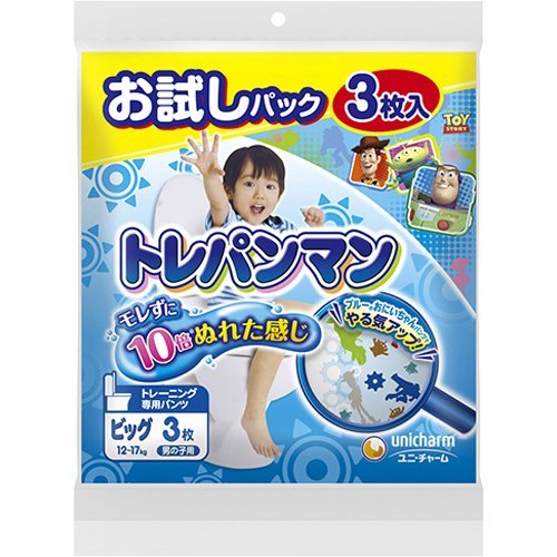 ●【商品説明】●「【数量限定】トレパンマン お試しパック 男の子用 ビッグサイズ 3枚」は、おしっこ実感シート搭載のトレーニング用紙おむつです。●おむつの10倍ぬれた感じを実現しました。●さらに、おしっこ2回分を吸収するので、万が一失敗しても安心。●また、男の子が気に入るトイ・ストーリーを採用したかっこいいデザインで、トレーニングのやる気を高めます。●【お問い合わせ先】●ユニ・チャーム株式会社お客様相談ダイヤル:0120-192-862受付時間(祝日を除く)月曜日-金曜日9:30-17:00●【原産国】●日本●【材質】●表面材:ポリオレフィン・レーヨン不織布吸水材:綿状パルプ、吸水紙、高分子吸水材防水材:ポリオレフィンフィルム止着材:ポリオレフィン伸縮材:ポリウレタン結合材:スチレン系エラストマー合成樹脂外装材:ポリエチレン●【ご注意】●使用上の注意・汚れた紙おむつは早くとりかえてください。●・テープは直接お肌につけないでください。●・誤って口に入れたり、のどにつまらせることのないよう、保管場所に注意し、使用後はすぐに処理してください。●保管上の注意・開封...