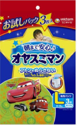 昼間のおむつを卒業したら!夜専用パンツのオヤスミマン。紙おむつLサイズの120%(当社製品比)の吸収力で、一晩中しっかり吸収してもらしません。お子様は安心してぐっすりねられます。また、大人気のディズニーデザインを採用し、男の子用には、1袋に3種類のかっこいいカーズデザインが入っているから、お兄ちゃん気分で楽しくはく事ができます。
