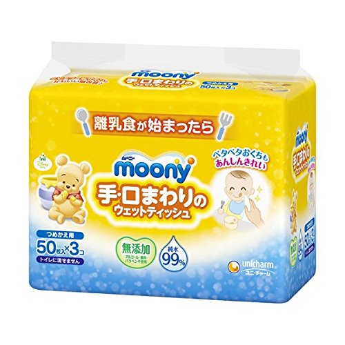 「ムーニーキッズ 手・口まわりのウエットティッシュ 詰替用 50枚×3コ」は、やわらか素材なので、赤ちゃんの手・口まわりの汚れをやさしくきれいに拭き取れます。ユニ・チャームオリジナル 『ピタッとシール(R)』搭載。片手で開けやすく、ピタッと止まって取り出しやすいです。ノンアルコール、無香料、パラベン無配合、純水99%。