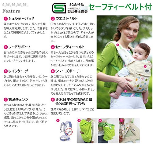 ★北欧の自然をイメージした生地を使用。★国際的に活躍しているグラフィックデザイナー&イラストレーターによるおしゃれなデザイン。★赤ちゃんと抱っこ紐をつなぎとめるセイフティーベルと付きで日本の製品安全協会(SG)認定済みなので安心です。★急な雨から赤ちゃんを守るレインケープ付き、防寒としても使えます。★シューズポーチは靴だけでなく小物入れとしても使えてとっても便利です。★抱っこひもを収納できるポーチも付いています。★便利なよだれパッドプレゼント!