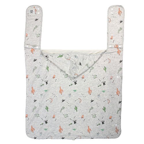 表地はひんやり接触冷感素材のモダールニットを使用、裏地には吸水速乾機能のある素材を使用した夏用のくるみケット。スナップボタンをとめるだけの簡単装着で退院のときのおくるみからおでかけまで長く使えるマルチなケープです。