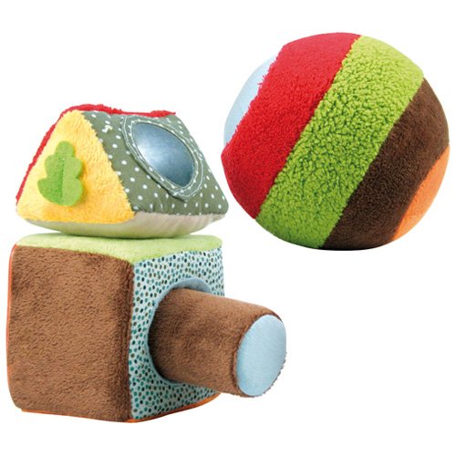 フランス・Latitude(ラティテュード)の積み木のように遊べるやわらか布製ブロックとボールのセットです。 お座りの頃の赤ちゃんが、片手でぎゅっと握ってボールを転がしたり、四角いブロックの上に三角のブロックを積んだり、細い棒を形はめにして入れてみたりと、遊びが楽しめる布製ブロックセットです。 手触りのちがう布が赤ちゃんの触覚を刺激し、鏡や縫い付けられた葉っぱ、振ると音が鳴るボールなど赤ちゃんの視覚・聴覚までを刺激するしかけがたくさんです。 赤ちゃんの発達段階や好みによって好きな遊びが生まれるので、出産祝いの贈り物にもピッタリです♪