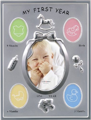 お子様の生後一年間の成長写真を3ヶ月ごとに増やして飾ることができるフォトフレーム。「お宮参り」「初節句」「お食い初め」など行事の写真を飾ることもできる。写真サイズ:ミニサイズ×4、L判×1。外寸:189×249mm、内寸:165×210mm、窓寸:34×48mm×4コ、78×106mm。縦置き専用。置掛兼用。材質:スチール、マットシルバーメッキ。