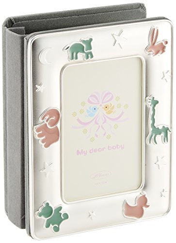 写真が80枚も収納可能な、どうぶつモチーフのアルバムフレーム。パステル調のベビーらしい色使いで、出産のお祝いにもぴったり。表紙のフレーム窓寸:120×77mm。ポストカード版(縦140-157mm×横90-107mm)の写真が80枚収納可能。サイズ:横13.8×縦18.2×厚さ6.2cm。材質:亜鉛合金、マットシルバーメッキ、エポキシ。
