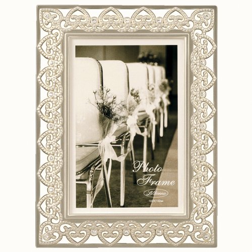 永遠の愛のメモリアル、ラドンナのブライダルフレーム。ハンガリー製クリスタルとハート形のデザインが優雅な雰囲気を漂わせる。結婚のお祝いや、結婚式の引き出物にぴったり。ポストカード判・Kサイズ。置き専用。縦横兼用型。外寸:151×202mm、内寸:104×154mm、窓寸:94×145mm。
