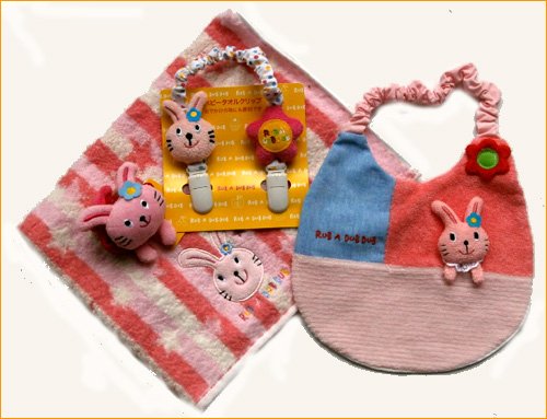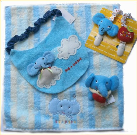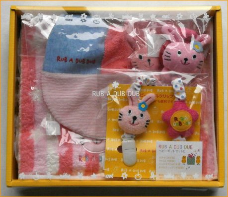 色がきれいで可愛くてと、今大人気のブランド=ラブアダブダブ=の新作ギフトセットが出来ました しかも人気商品ばかりを集めて箱詰めした、とっても嬉しいギフト企画です。よくぞここまでのギフトを作ってくれました!大感謝 4点も入ってしかもこのお値段で日本製は嬉しい!! ギフトや出産お祝いでお悩みのお客様は、これで決まりです。贈って喜ばれること間違いなしです どのママも欲しかったブランドですよ。贈るかたのセンスがしのばれるギフトです。 タオル 33cmX32cmの大きさ 滑らか仕上げをしていますので肌触りはメチャメチャいいですよ。とってもわやらかふんわり仕上がりです タオルは何かと必要で何枚あっても重宝ですし、いつも新しいタオルを使いたいですね。 滑らか仕上げのタオルですので、お口やお肌に優しく吸湿性もたっぷり。 スタイ スタイも何枚あっても重宝するものです。マスコットが取り出せたりキュッキュッ音がする遊び心あふれたスタイです これもまた便利で重宝なアイテム=スタイホルダーです。お出かけの時などママのバッグに入れておけば 急な時、すぐにスタイを作れます。ママのハンケチやミニタオルをポチット破産で上げてください リストラル==赤ちゃんは音の出るものにはとっても興味をしめします。まして自分で動かして音が出るので 興味深深で一人遊びをします。またお昼寝から起きた時などすぐに判って便利です 必ず1個は揃えておきたいアイテムが入っています 以上4点が入った自信を持ってお勧めするギフトです