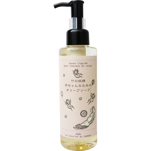 ●【商品説明】●「竹の妖精 赤ちゃんのためのオリーブソープ 200g」は、石油系合成化学成分(界面活性剤、乳化剤、防腐剤、香料、着色料等)を一切使用していない、竹ミネラルと良質のスペイン産のオリーブオイルがベースの全身用シャンプーです。●厳選した材料を使い、時間を惜しまずゆっくりと釜で炊き上げました。●きめ細かい泡立ちで、赤ちゃんのお肌をいたわりながら優しく洗い上げます。●【お問い合わせ先】●販売元ラレシーブオーバンブー合同会社TEL:042-467-9891製造元桶谷石鹸株式会社●【原産国】●日本●【品質表示】●成分:水、グリセリン、オリーブオイル、水酸化K、クエン酸、竹炭ミネラル抽出液、竹炭灰ミネラル抽出液●用途:全身用●【保存方法】●常温●【ご注意】●お肌に異常が生じた場合や、お肌に合わない場合は使用を中止してください。●目に入った場合は水で洗い流してください。●石油系合成化学成分(界面活性剤、乳化剤、防腐剤、香料、着色料等)は、一切使用しておりません。●【使用方法】●全身をぬるま湯でよく洗い流し、適量をつけて、やさしく洗った後、よくすすいでく...