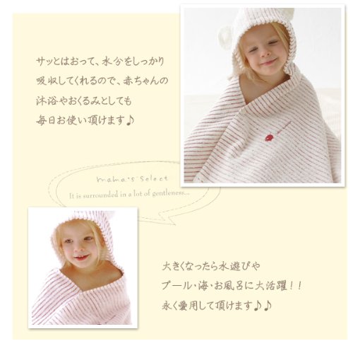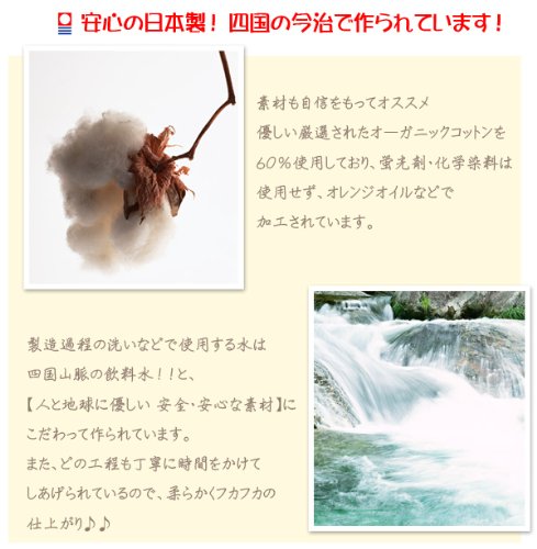 サッとはおって、水分をしっかり吸収してくれるので、 赤ちゃんの沐浴やおくるみとしても毎日お使い頂けます♪ 大きくなったら水遊びやプール・海・お風呂に大活躍!! 永く愛用して頂けます♪♪ ♪ 安心の日本製!四国の今治で作られています! 素材も自信をもってオススメ☆☆ 優しい厳選されたオーガニックコットンを60%使用しており、 蛍光剤・化学染料は使用せず、 オレンジオイルなどで加工 されています。 製造過程の洗いなどで使用する水は四国山脈の飲料水!!と、 【 人と地球に優しい 安全・安心な素材】にこだわって 作られています。 また、どの工程も丁寧に時間をかけて しあげられているので、 柔らかくフカフカの仕上がり♪♪ ウェアのシャーリング地は細番手糸が使われているので、 とてもしなやかな肌ざわりでデリケートなお肌にぴったりです! 敏感な赤ちゃんのお肌にも安心して気持ちよくお使いいただけて、 実用性もバツグン!! ご自宅用はもちろん 【ギフト】にも 大人気アイテムです☆。