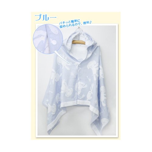 パイルとガーゼ素材の、肌ざわりがとっても気持ちいい! バスタオルです。 耳付きフードが付いてとってもキュート♪♪ パイル部分はふわふわの無撚糸、 ガーゼ部分は 細い糸で作られているので、 とっても軽くて、 ふんわりやわらかな肌触りと抜群の吸水性!! ※無撚糸とは、ネジリのかかっていない糸で、 わたのようなフワフワの肌触りで吸水性に優れ、 赤ちゃんやお肌の敏感な方にも安心してお使い頂けます。 サッとはおってスッポリ包み込み、水分をしっかり吸収して くれるのでママも大助かりです。 赤ちゃんの沐浴や おくるみとしても毎日お使い頂けます♪ 大きくなったら水遊びやプール・海・お風呂に大活躍!! 永く愛用して頂けます♪♪ 安心の日本製!四国の今治で作られています。 綿100%なので、衛生面においても安全・安心! どの工程も丁寧に時間をかけて仕上げられているので、 柔らかく吸水性の良い仕上がり♪♪です。 敏感な赤ちゃんのお肌にも安心して気持ちよく お使いいただけて、実用性もバツグン!! ご自宅用はもちろん 【ギフト】にも大人気アイテムです☆
