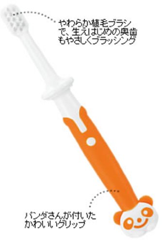 やわらか植毛ブラシで、生えはじめの奥歯もやさしくブラッシングします。パンダさんが付いたかわいいグリップ。